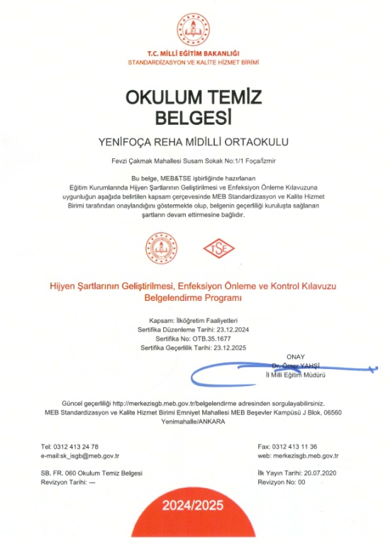 Okullarda hijyen şartlarının geliştirilmesi,enfeksiyon önleme ve kontrol süreçlerinin tutarlı olması amacıyla sürdürülen "Okulum Temiz" programına başvuran okulumuz belge almaya hak kazandı. Başvuru sonrasında, Bakanlığımız ve TSE işbirliğinde oluşturulan eğitim iile yetkilendirilen görevlilertarafından okulumuz yerinde denetlenip kontrol sonucunda temiz okul belgesi almaya hak kazanmıştır.